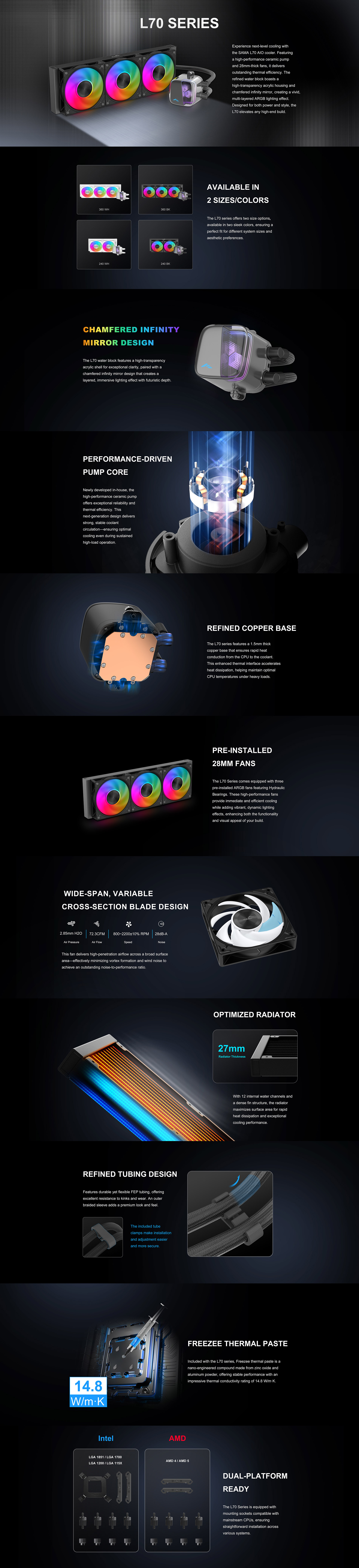 Experience advanced cooling with the SAMA L70 AIO: a high-performance ceramic pump and 28mm-thick fans ensure excellent thermal efficiency, while its acrylic water block with chamfered infinity mirror delivers vivid, multi-layered ARGB lighting for both power and style.